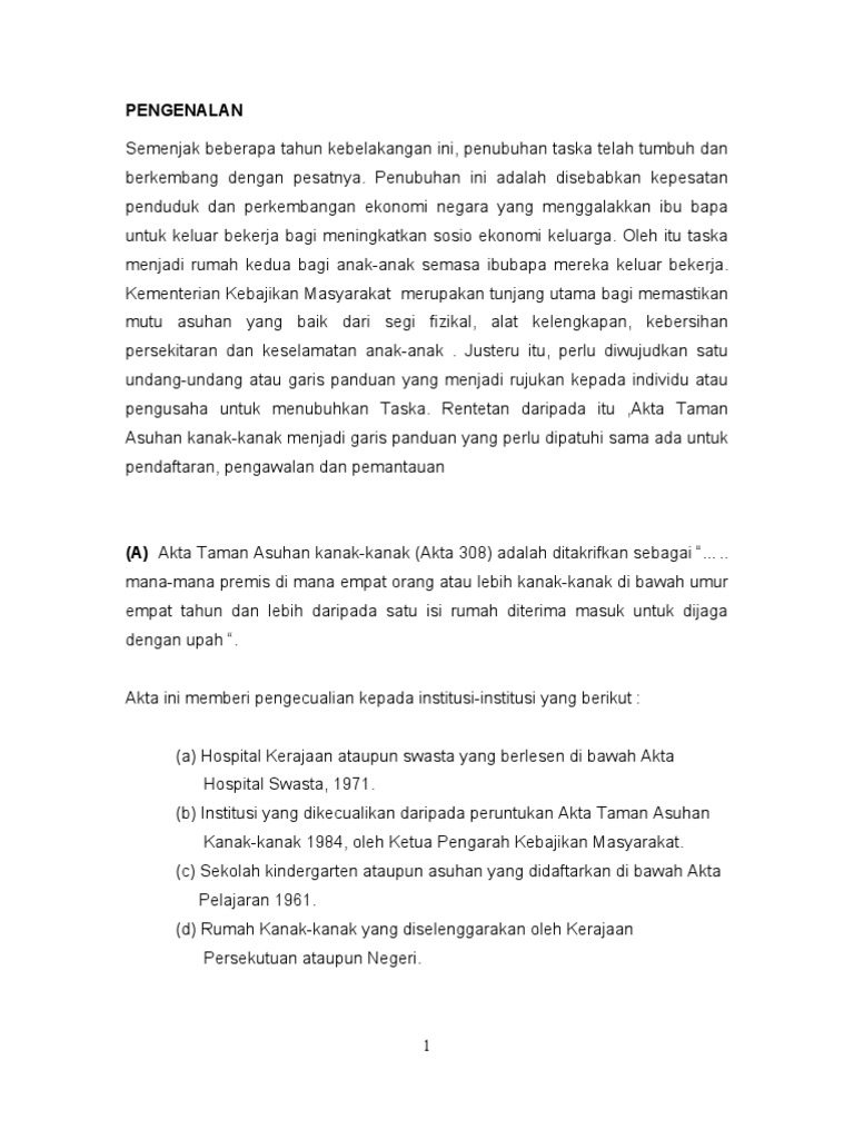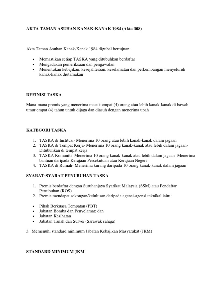 Ketika ini katanya hanya taska dan taman asuhan yang dikuatkuasakan di bawah Akta Taman Asuhan Kanak-Kanak 1984 melibatkan garis panduan dan peraturan yang ditetapkan. Di bawah Seksyen 2 Akta 308 taman asuhan kanak-kanak ertinya mana-mana premis yang menerima masuk empat 4 orang atau lebih kanak-kanak di bawah umur empat 4 tahun dari lebih daripada satu isi rumah untuk dijaga dengan upah. Kandungan akta dan peraturan yang berkaitan Taman Asuhan kanak-kanak i Akta Taman Asuhan Kanak-kanak 1984 pindaan 2007 Akta 308 Akta ini mewajibkan semua TASKA didaftarkan di bawah Jabatan Kebajikan Masyarakat Malaysia untuk tujuan pemantauan kualiti dan bantuan khidmat perundingan dan latihan.